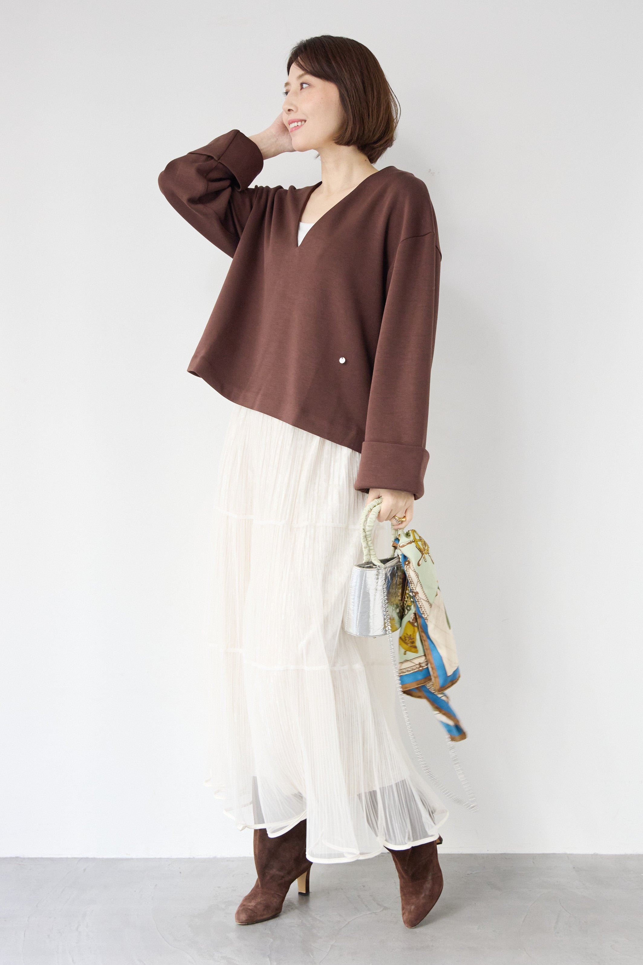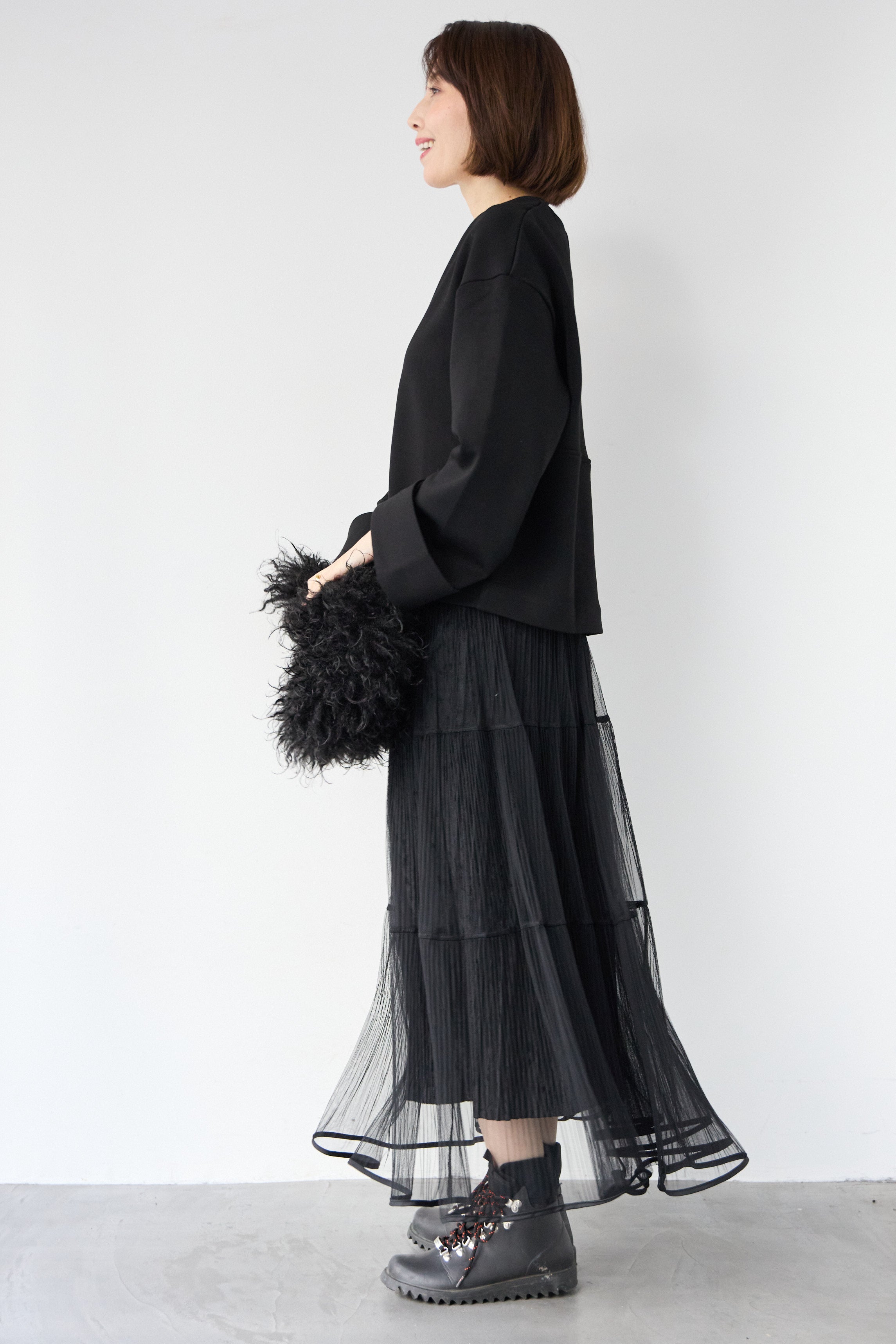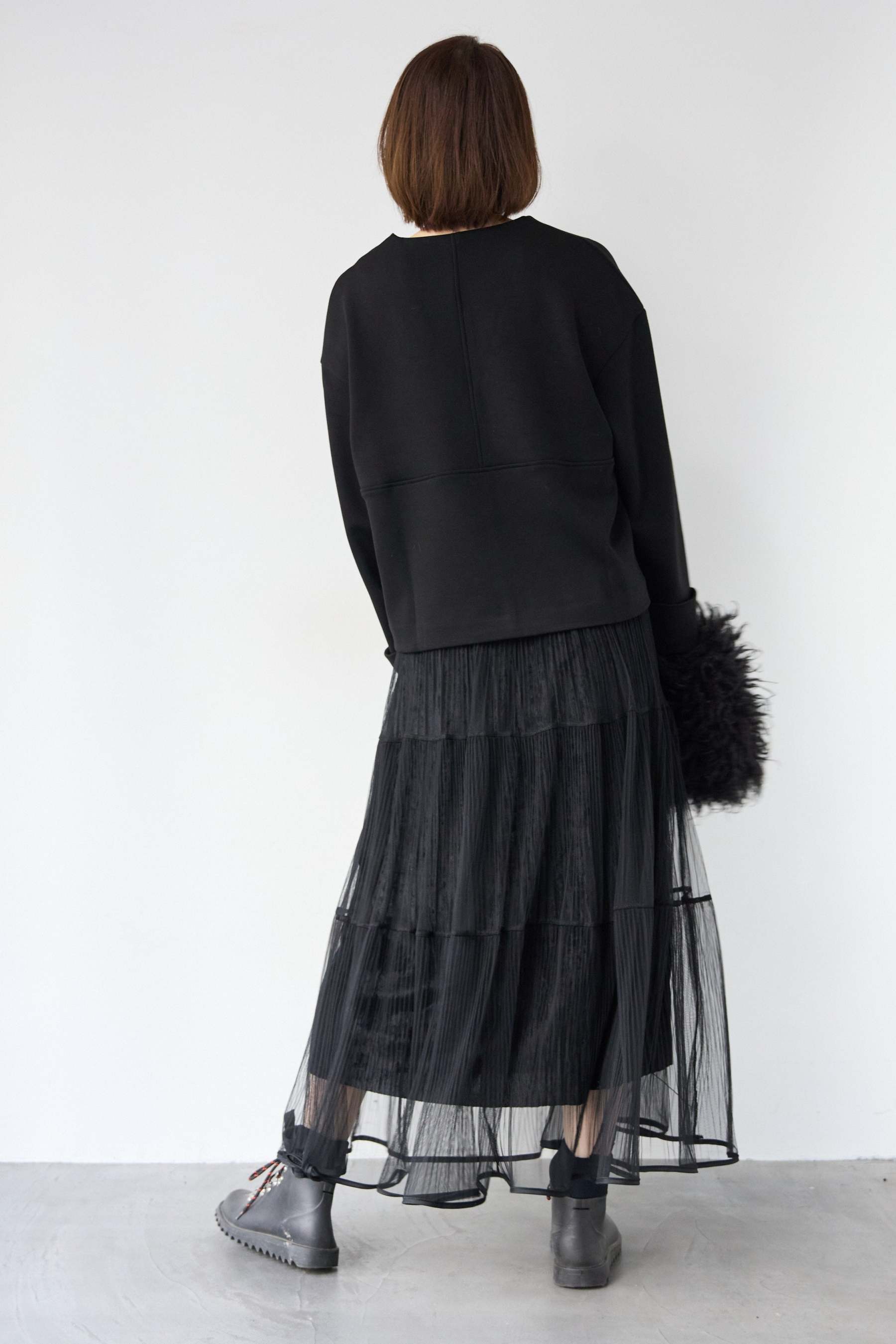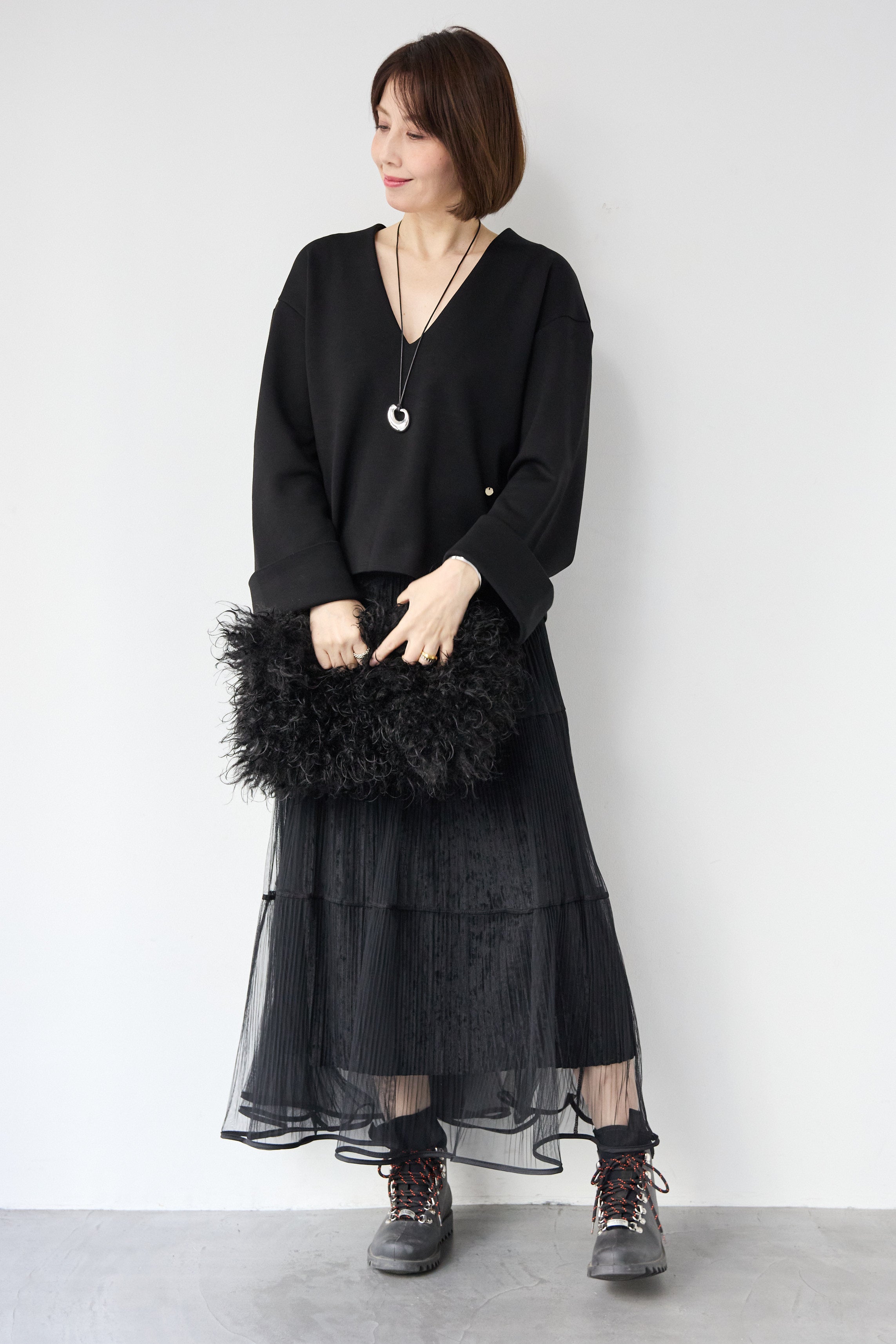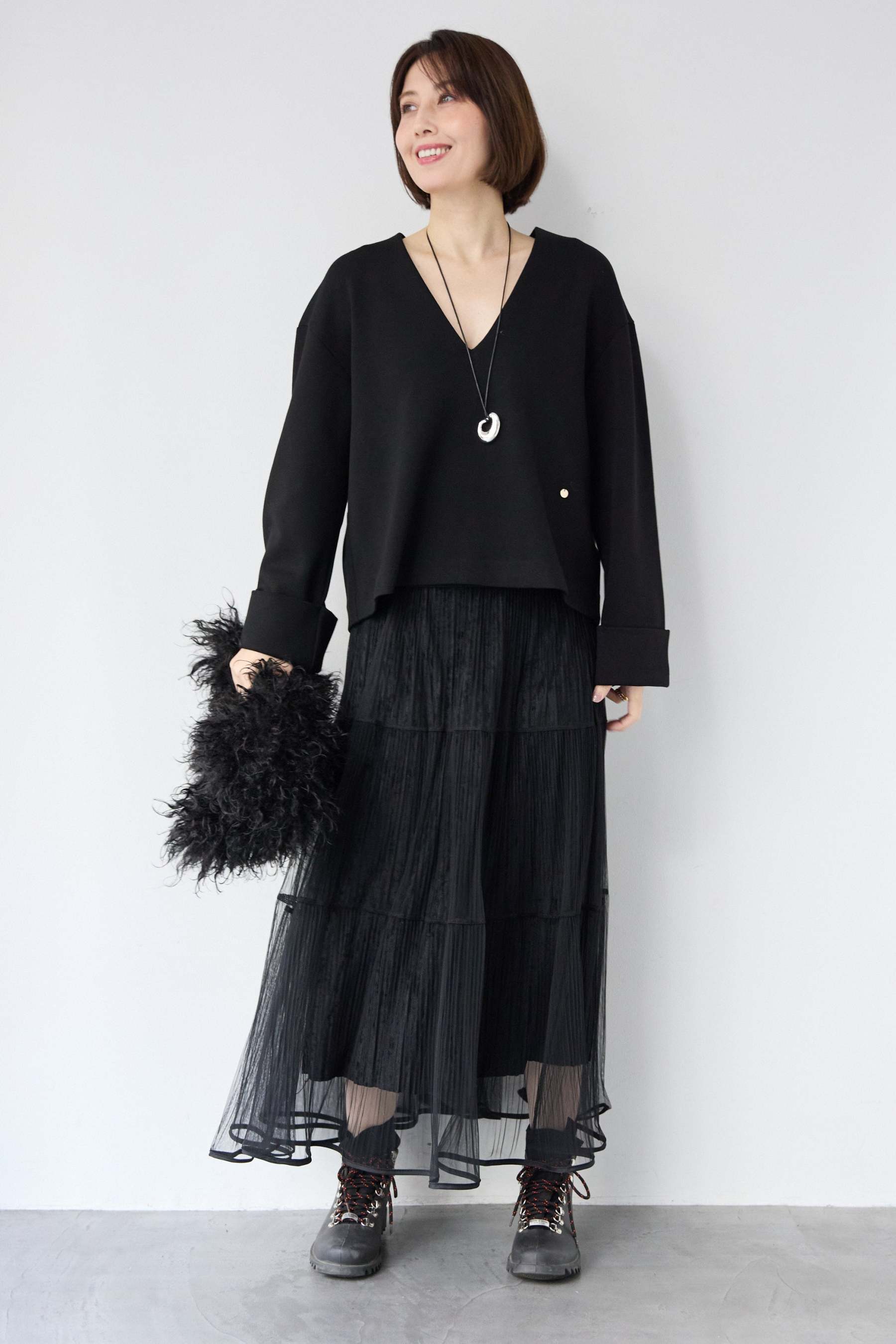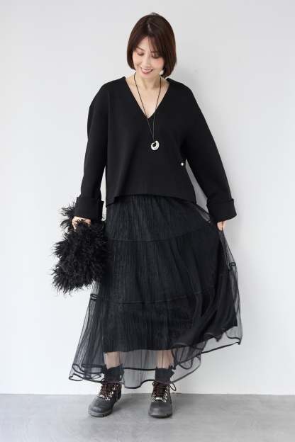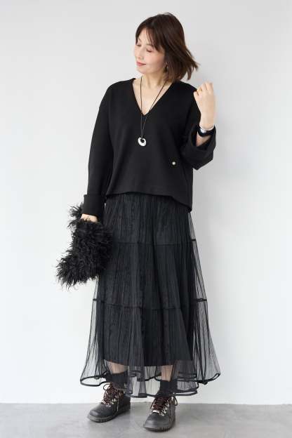 [SET]Vネックフリースダンボールプルオーバー+ライトチュールマキシスカート(2set)