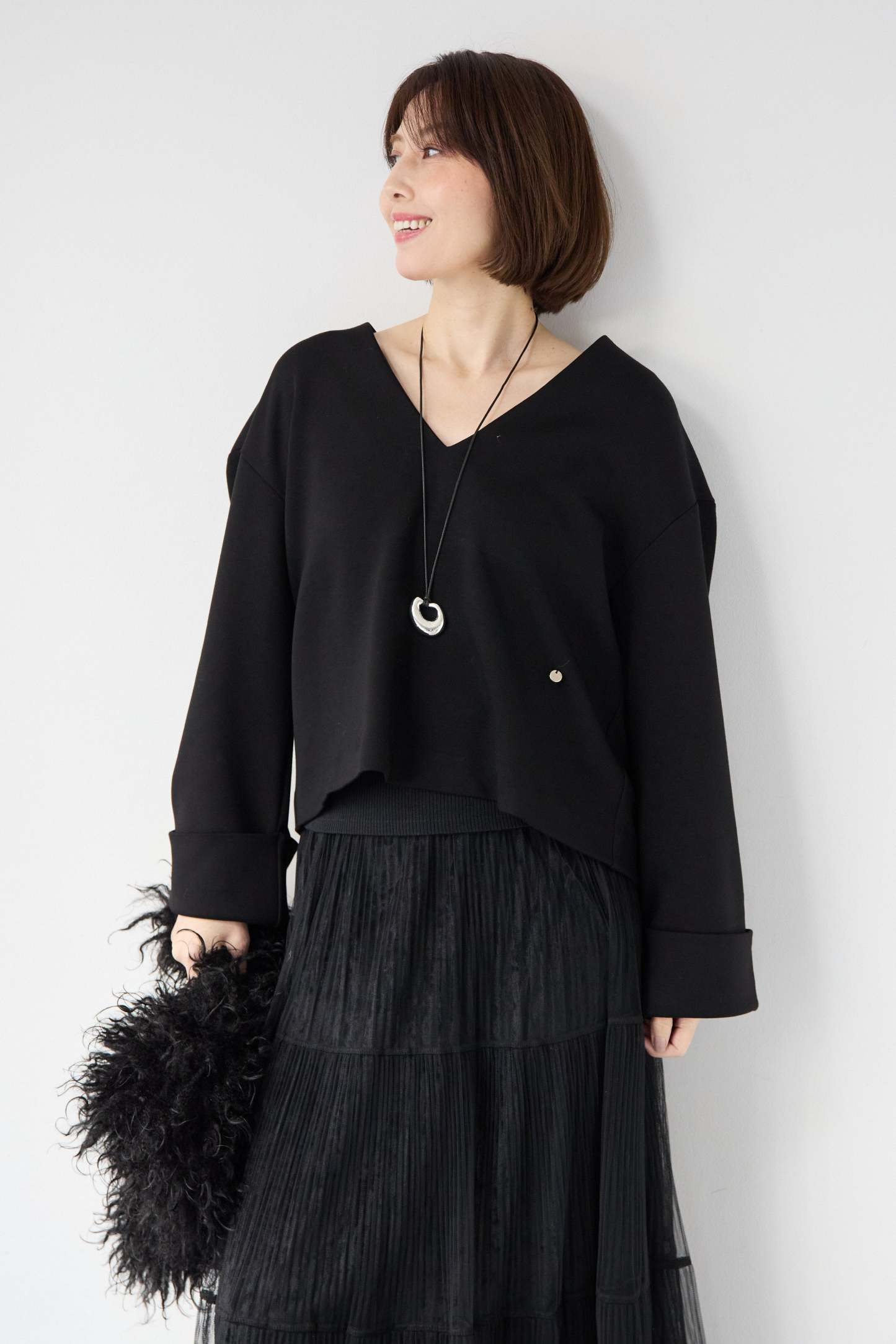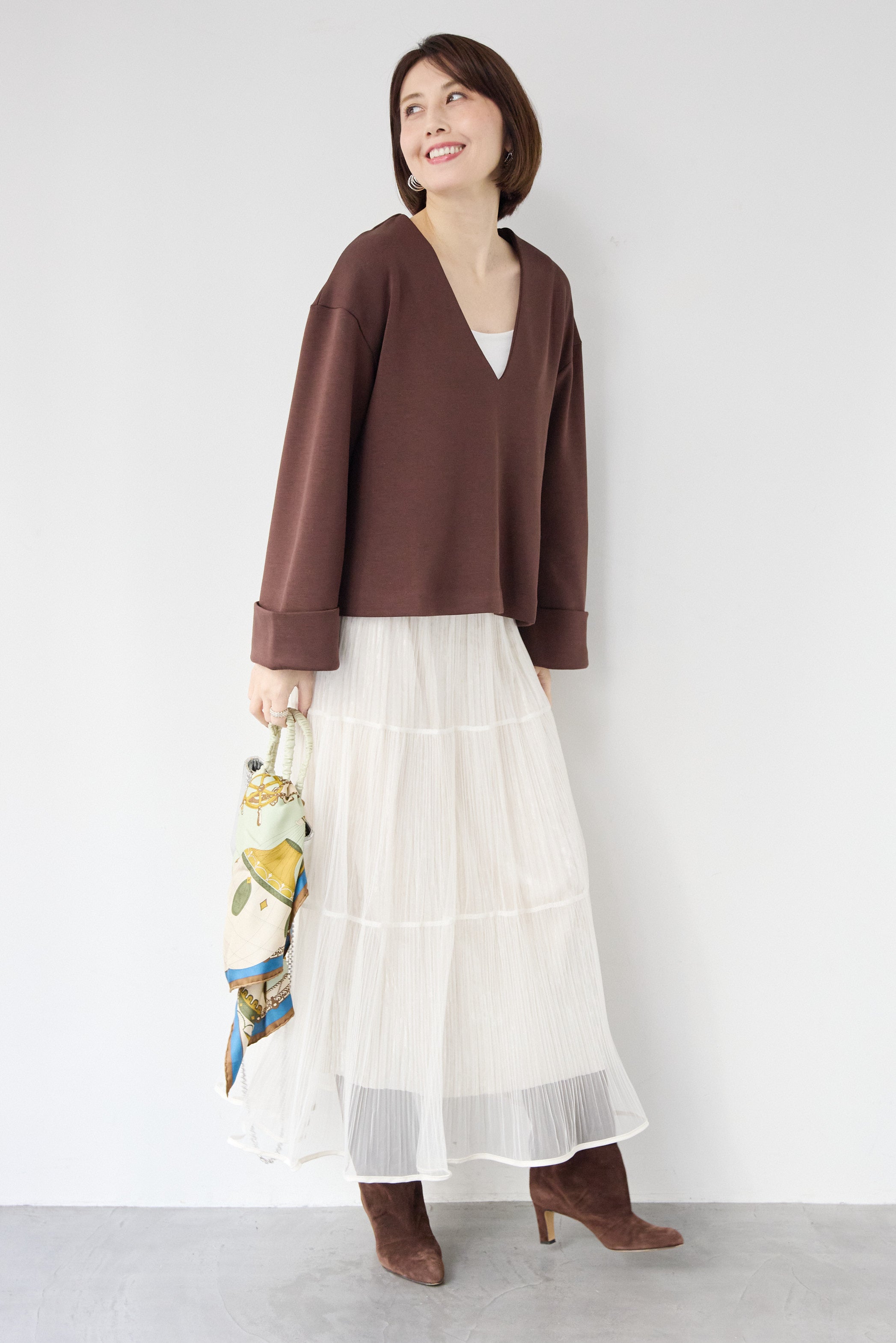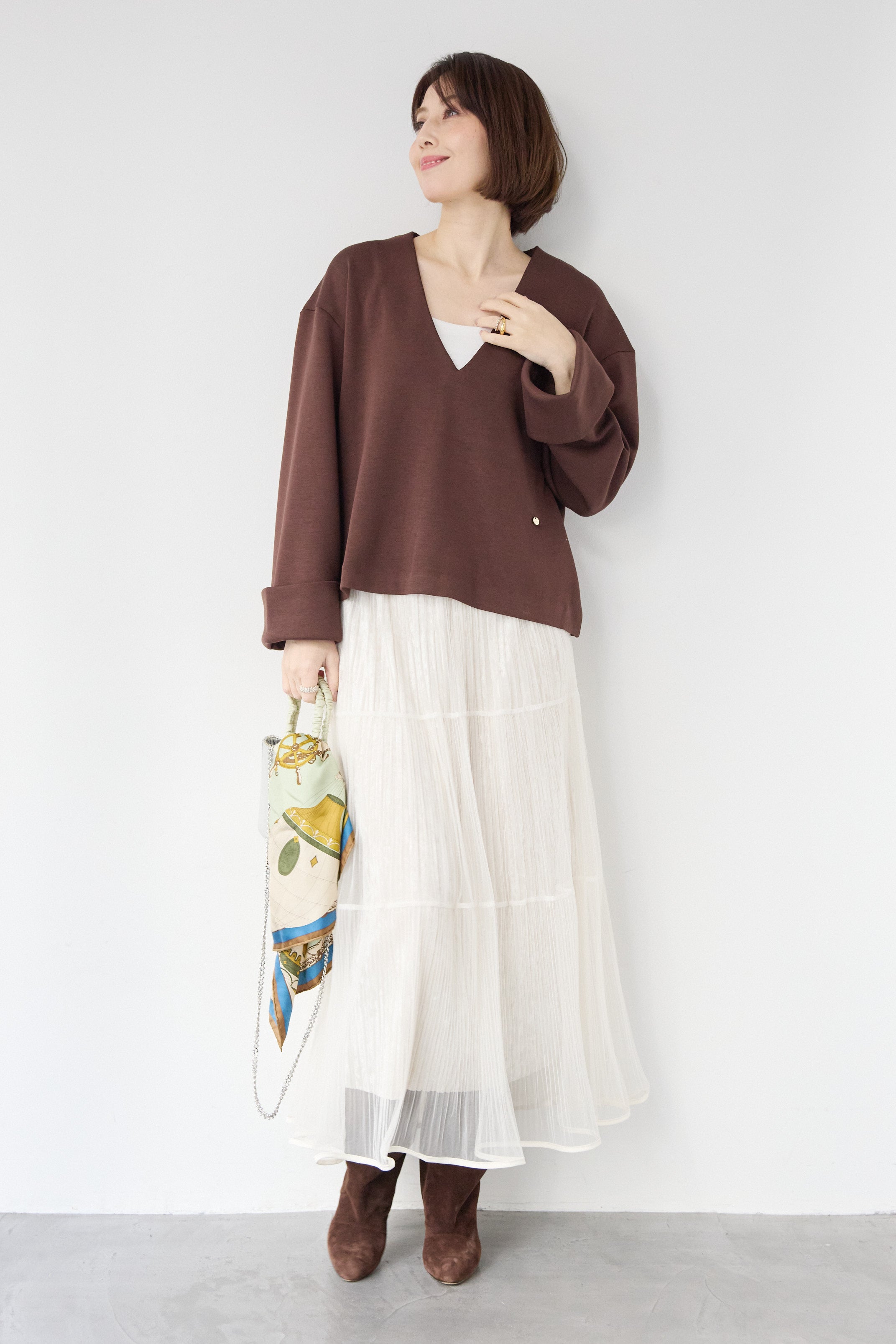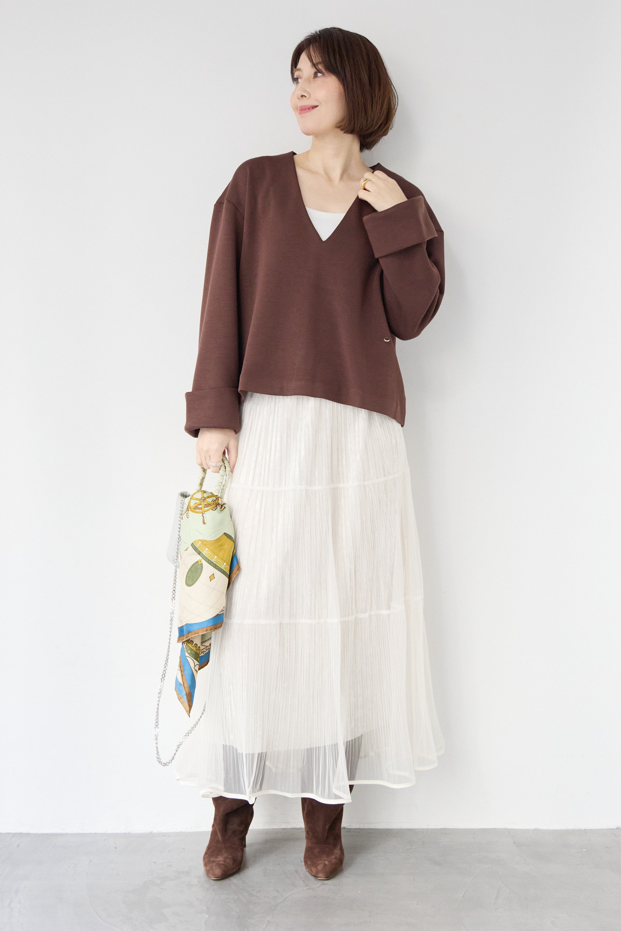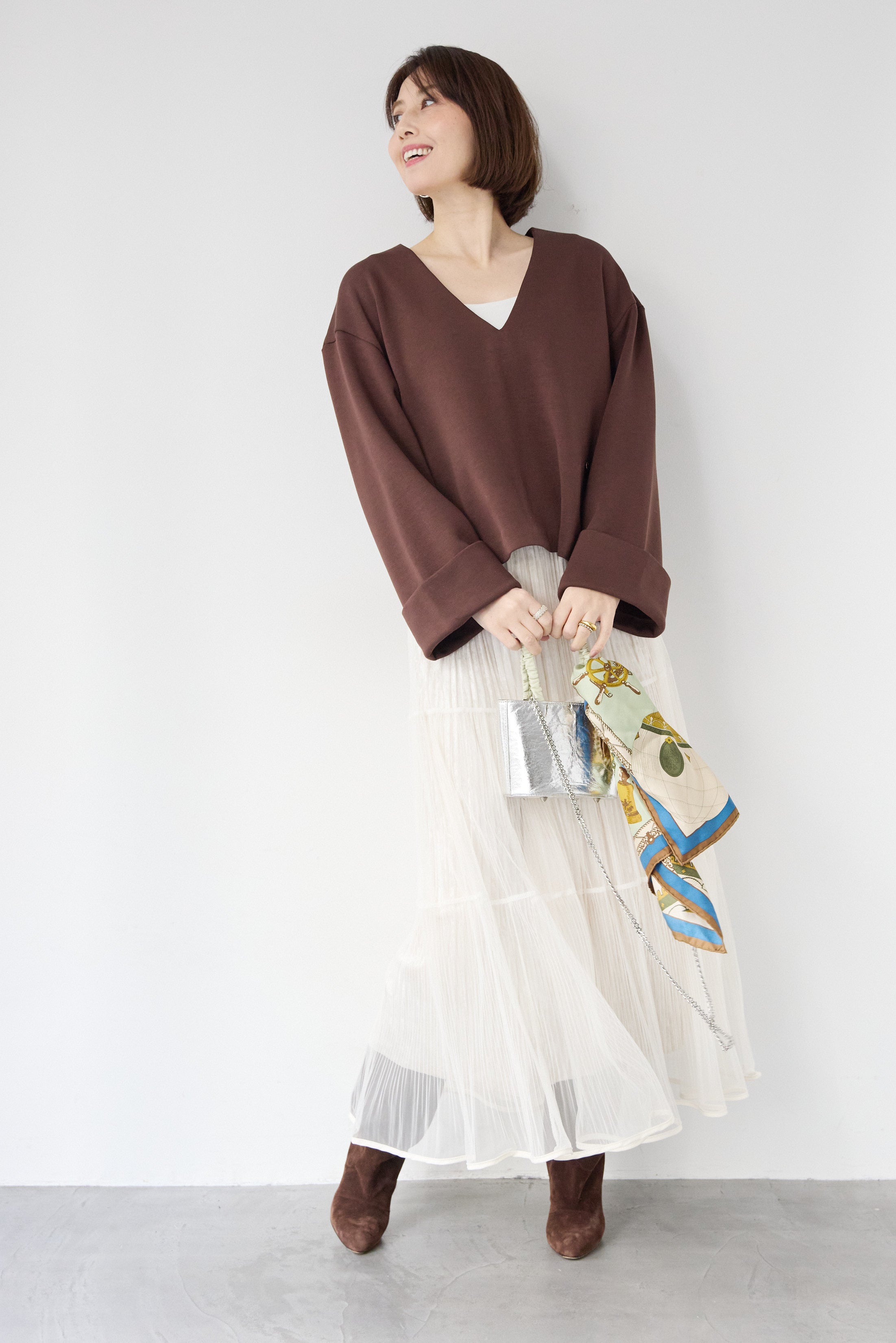 [SET]Vネックフリースダンボールプルオーバー+ライトチュールマキシスカート(2set)