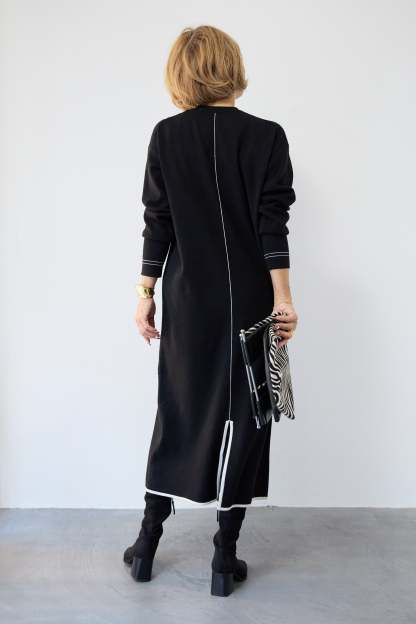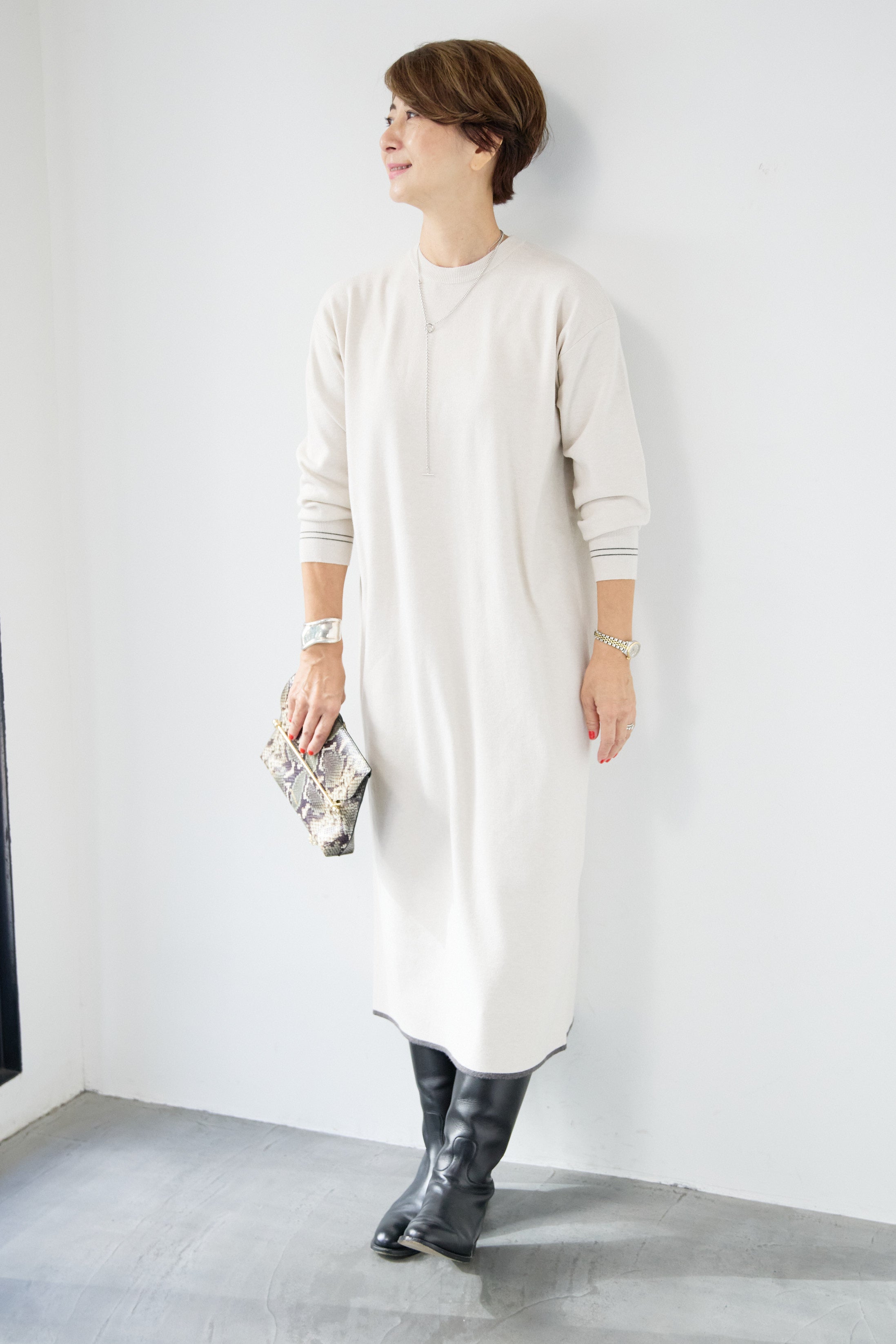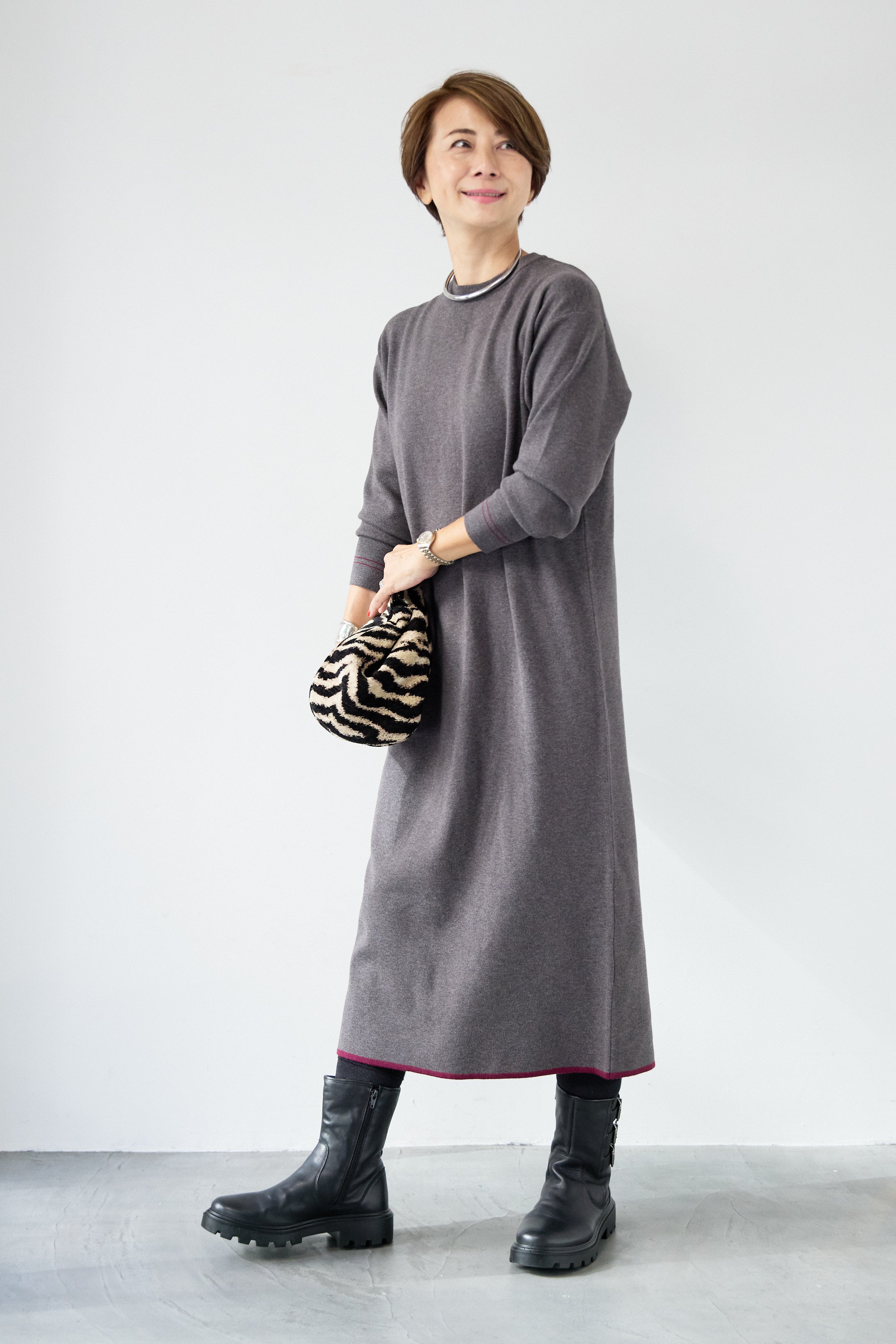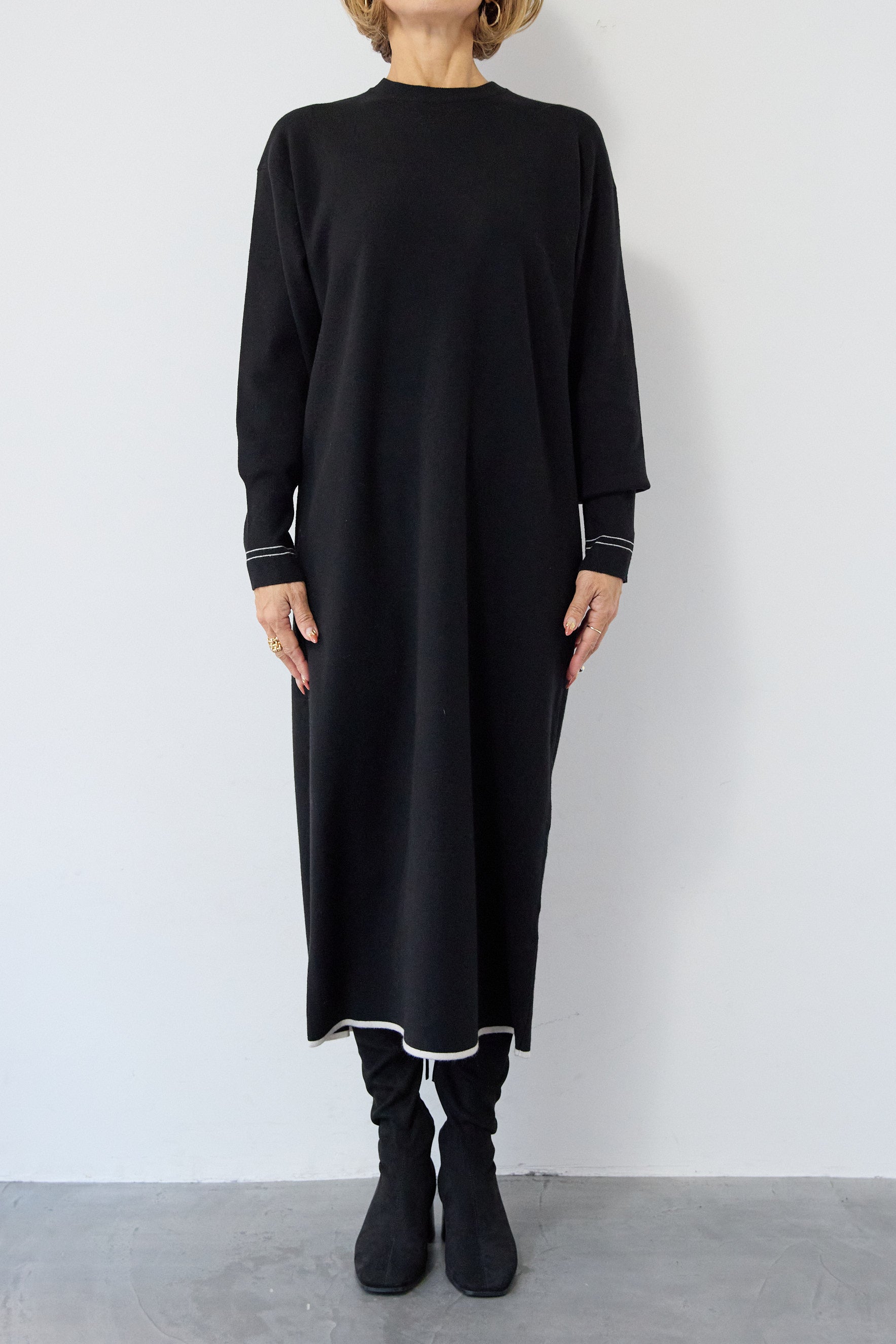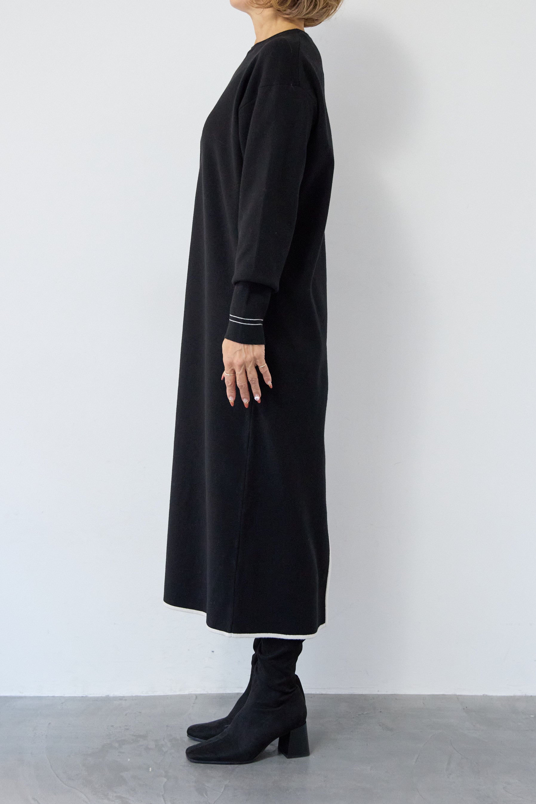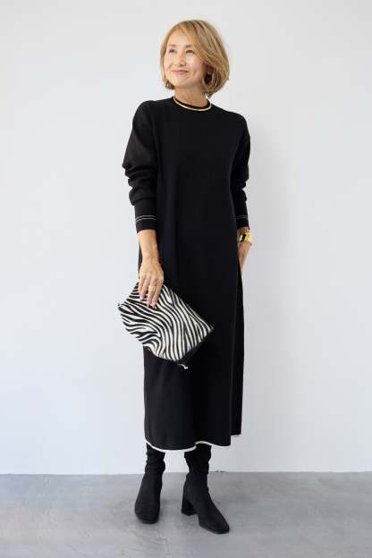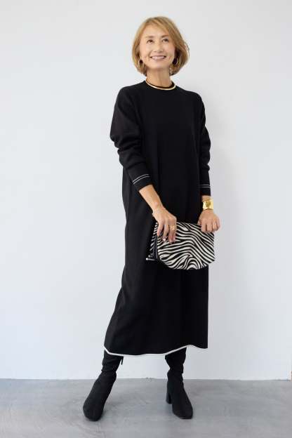 【防静電気】配色ラインやわもちニットクルーネックワンピース