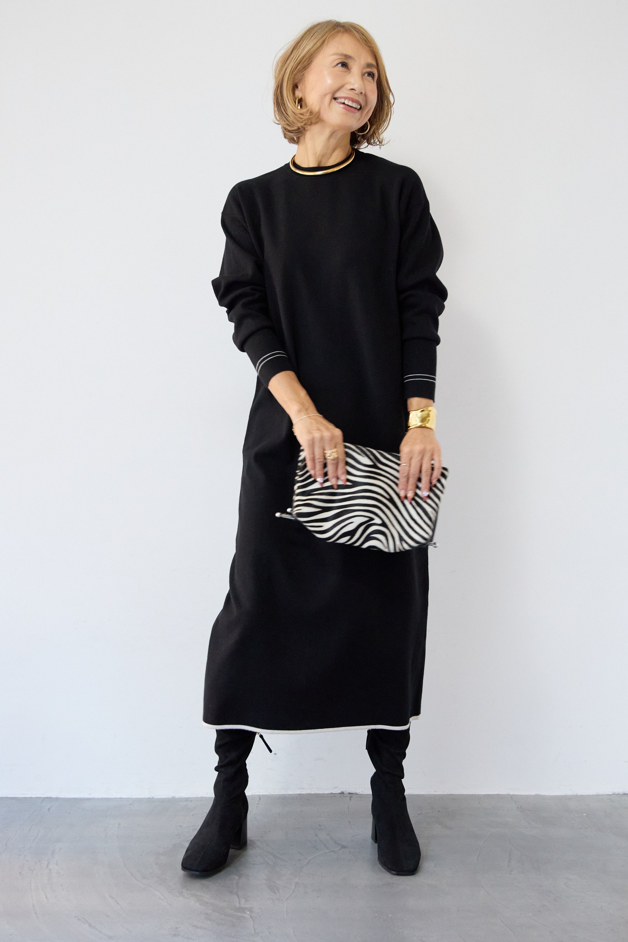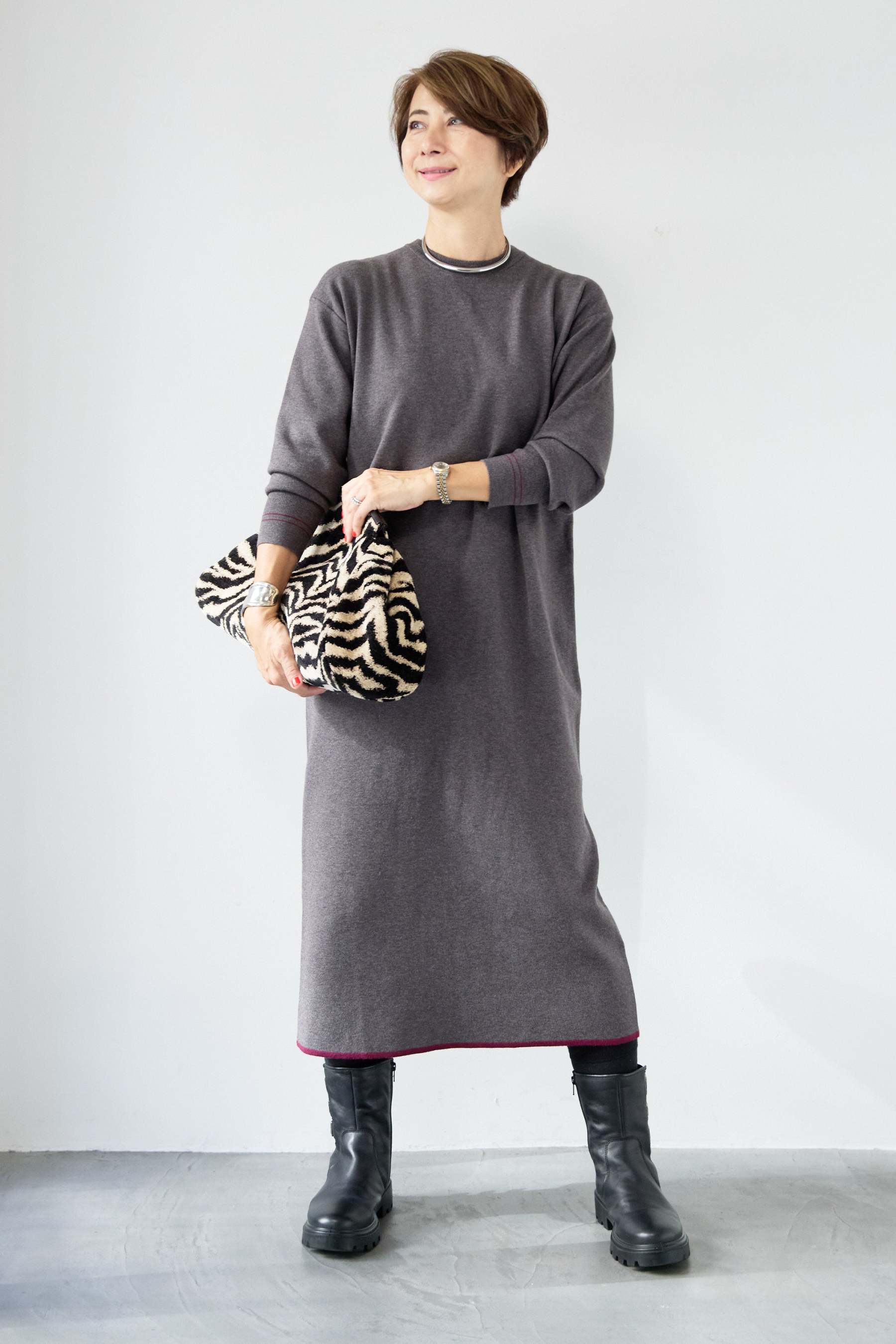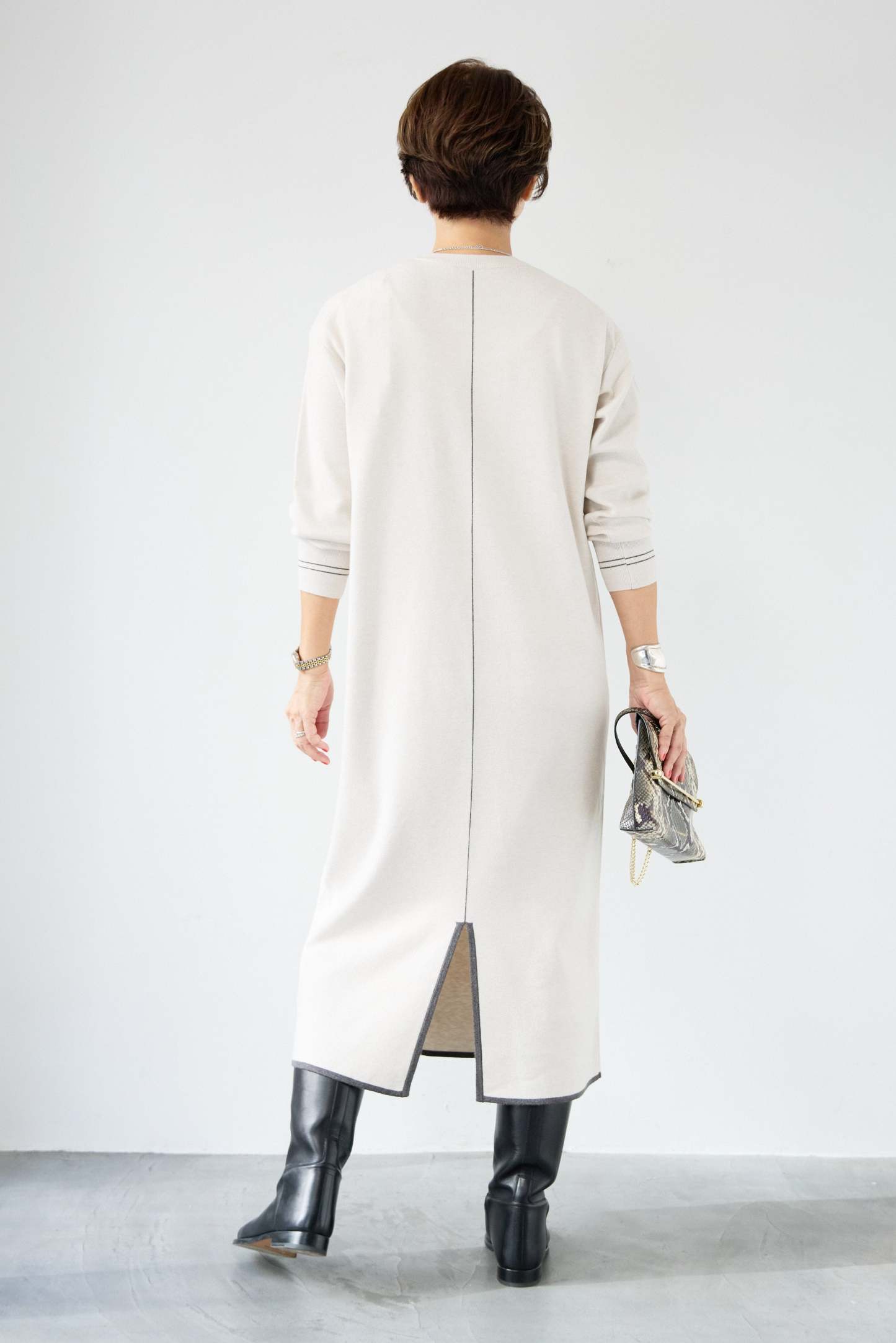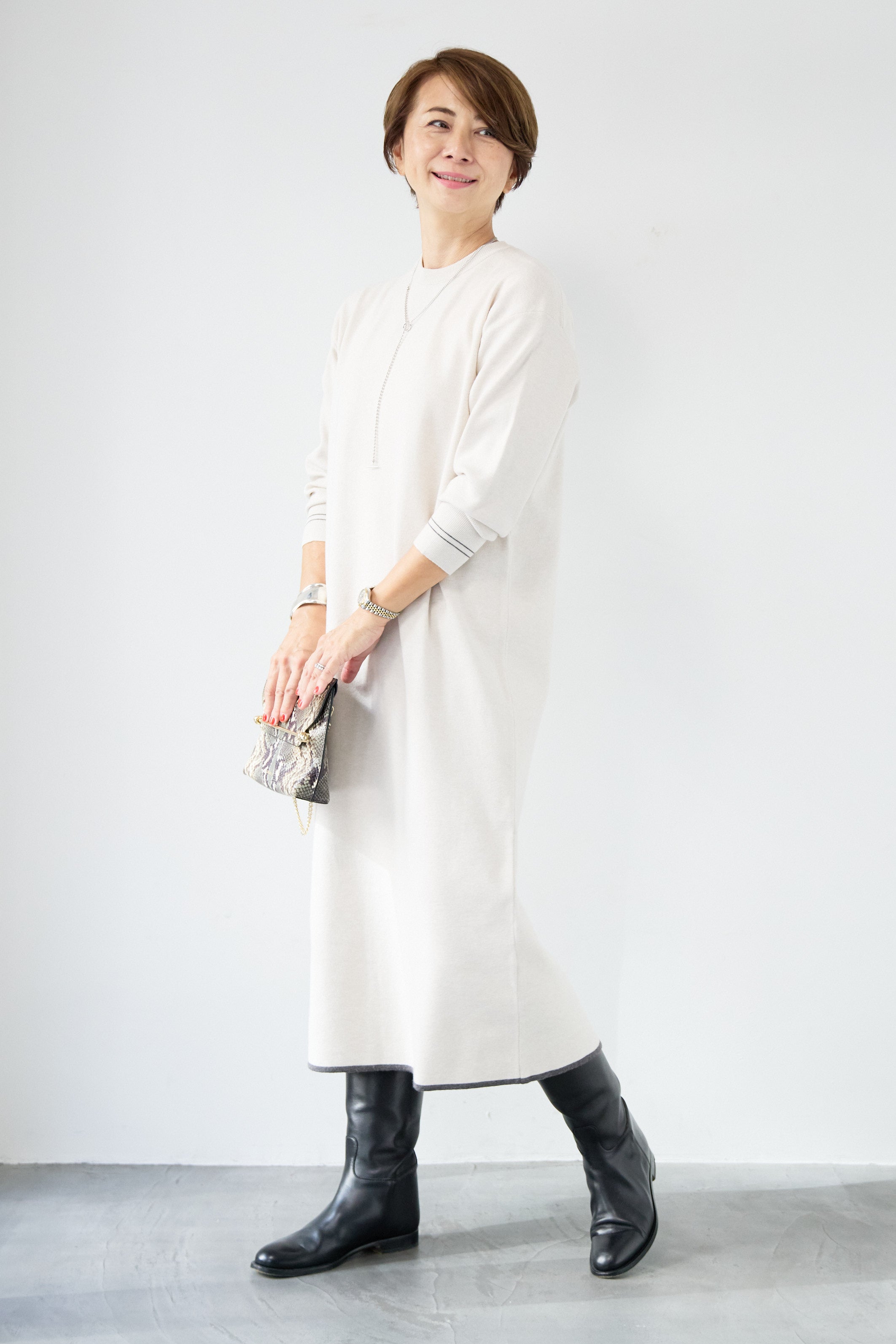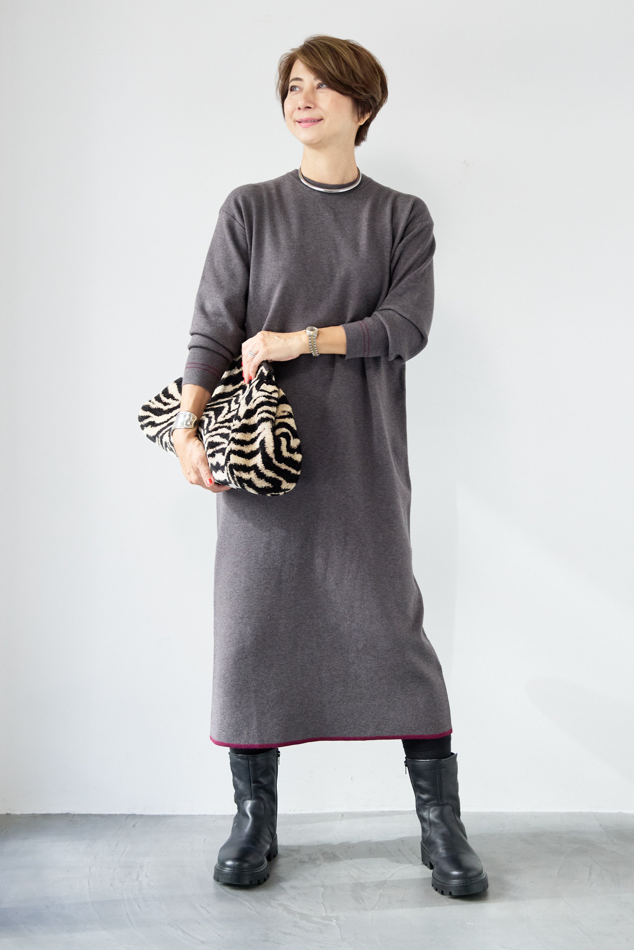 【防静電気】配色ラインやわもちニットクルーネックワンピース