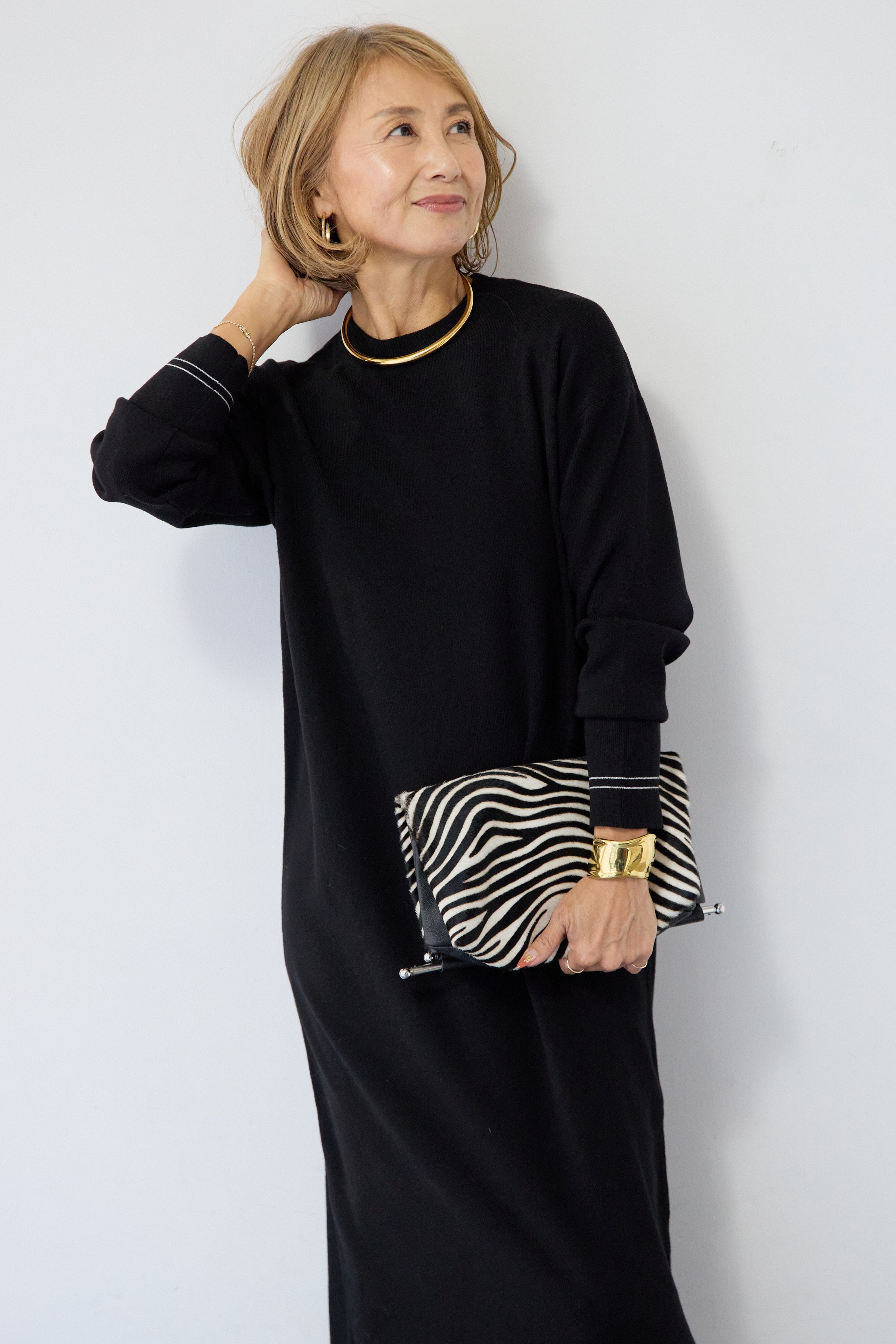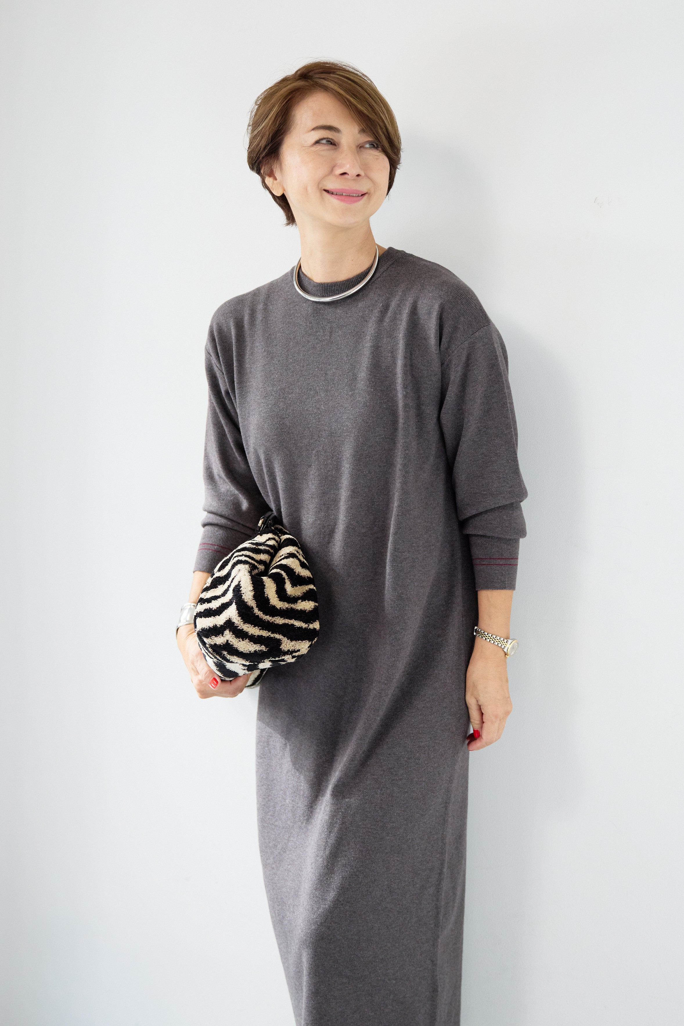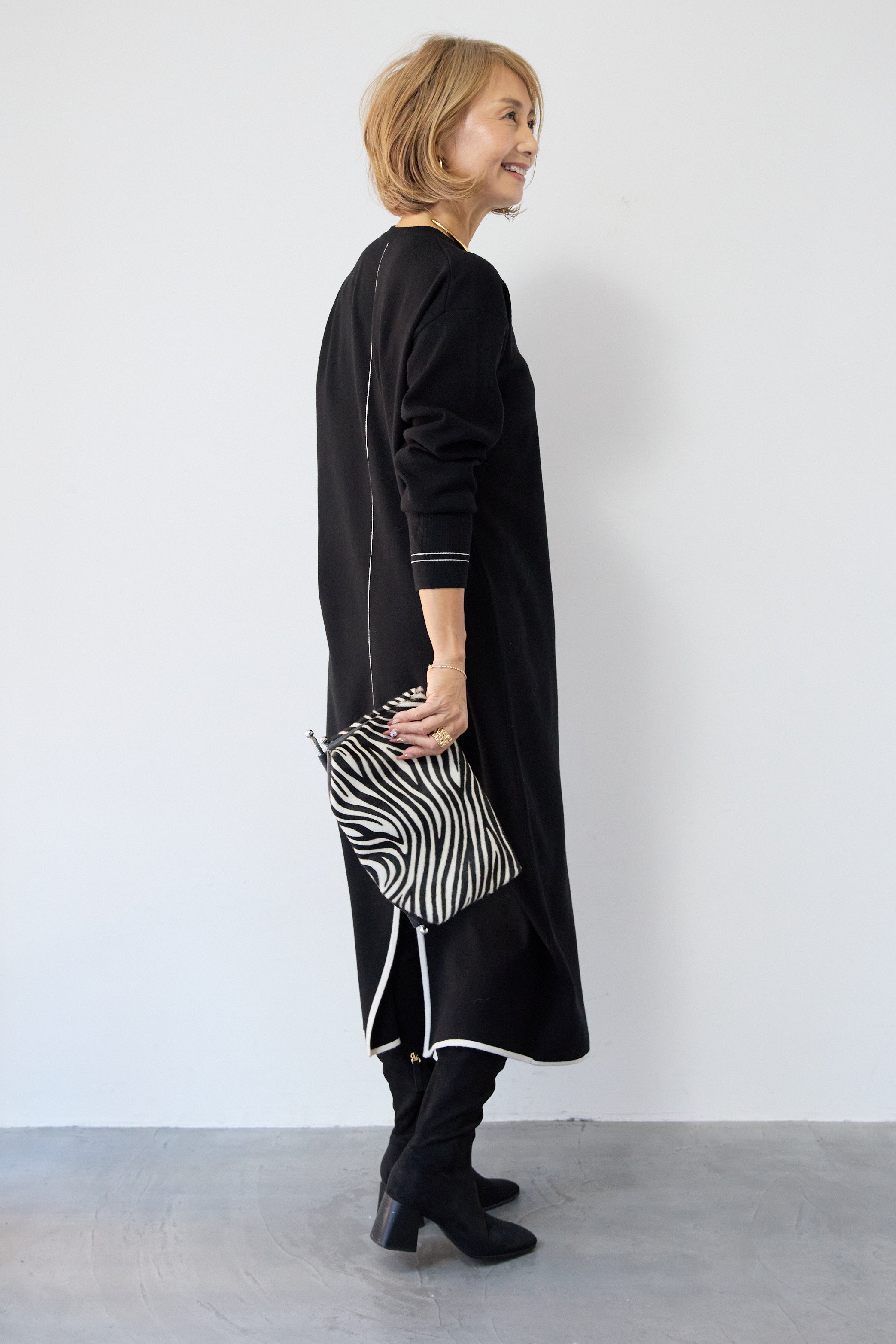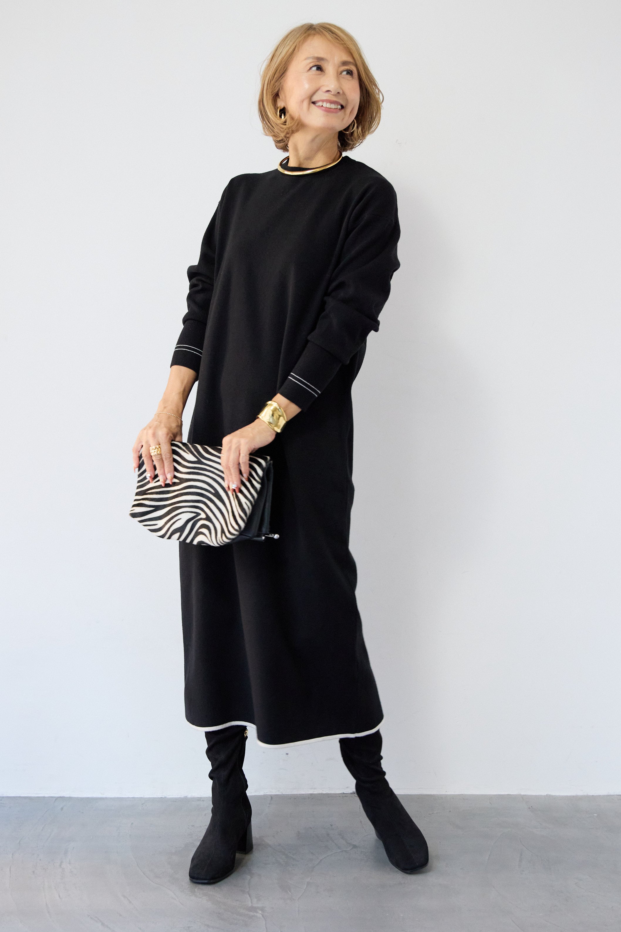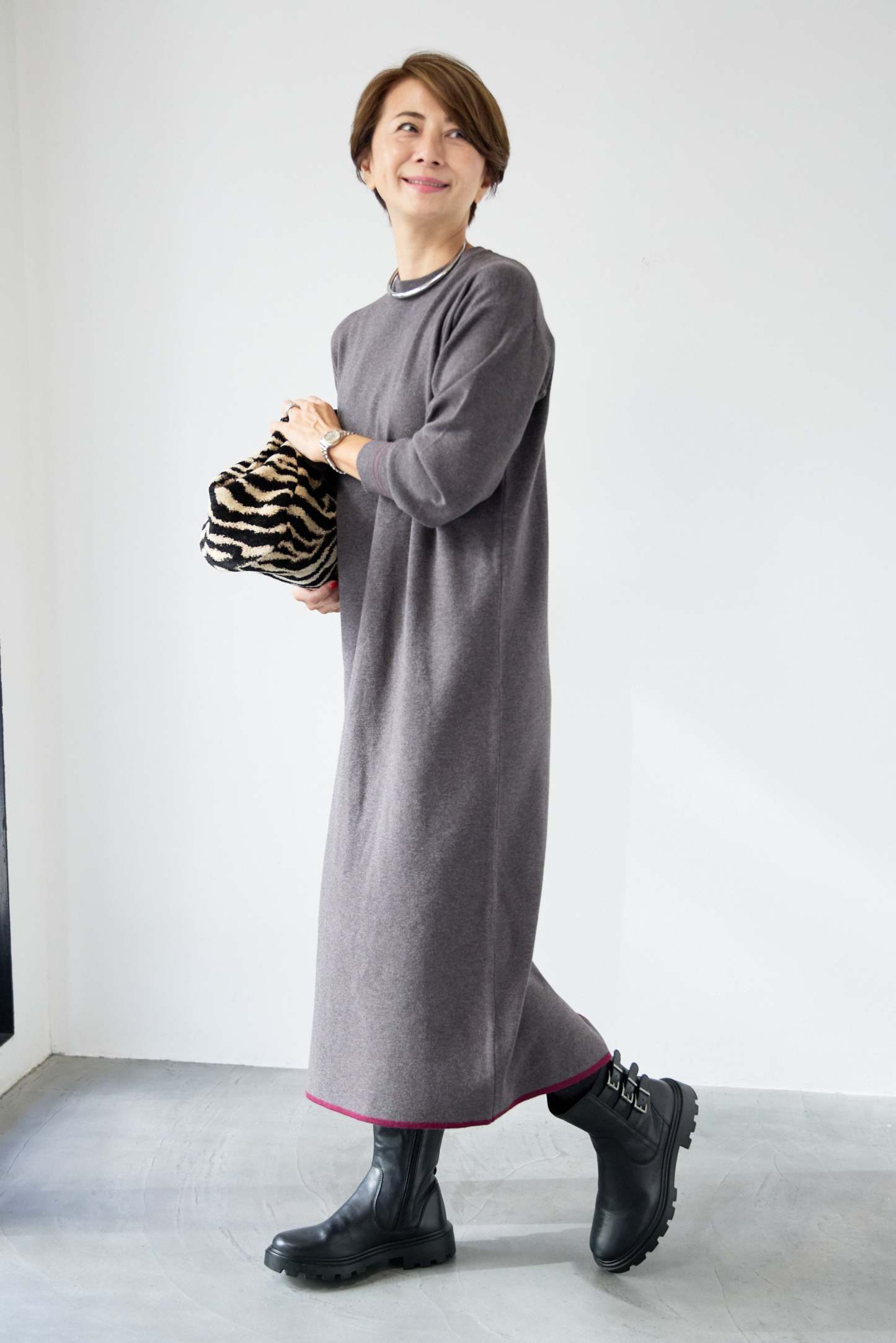 【防静電気】配色ラインやわもちニットクルーネックワンピース