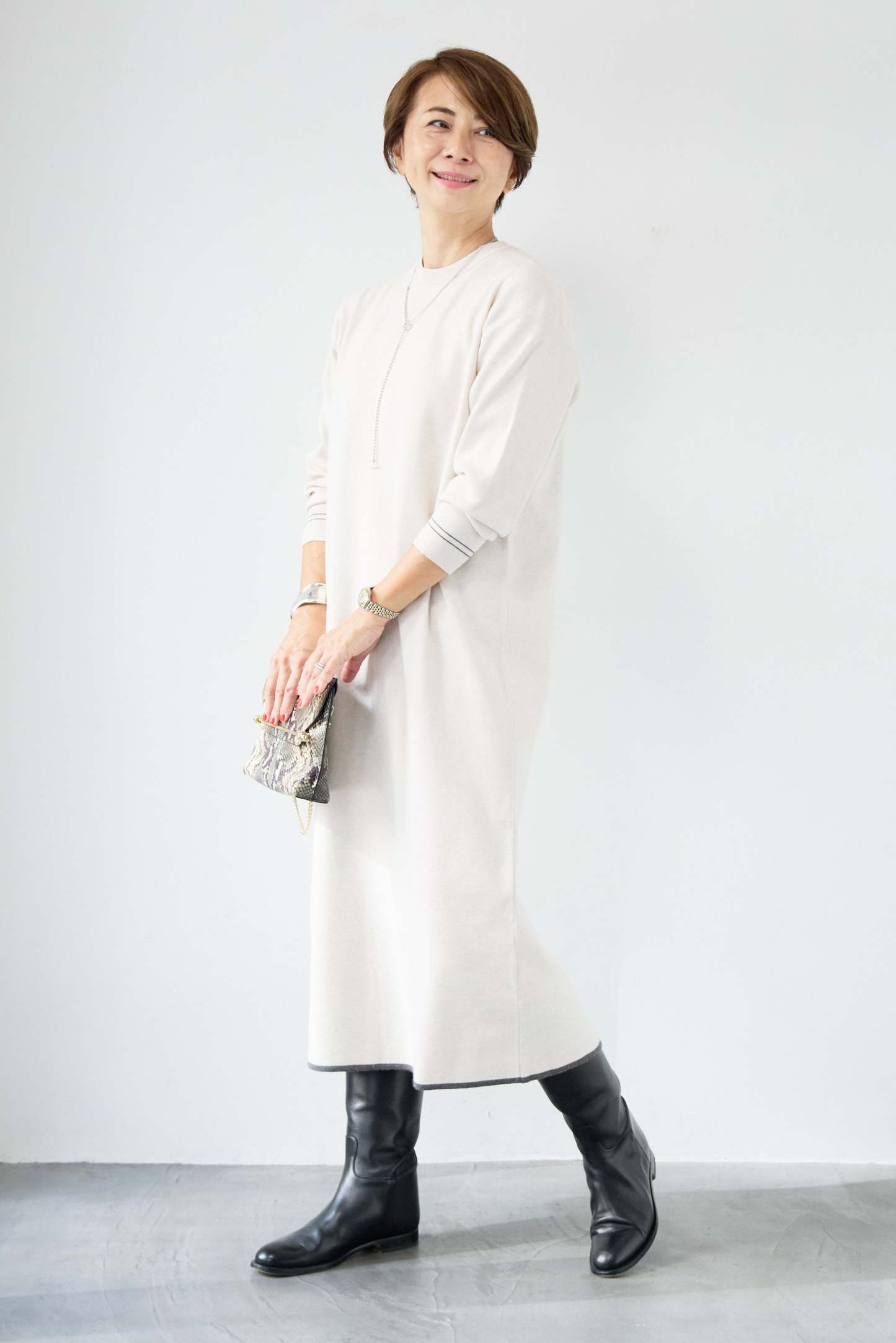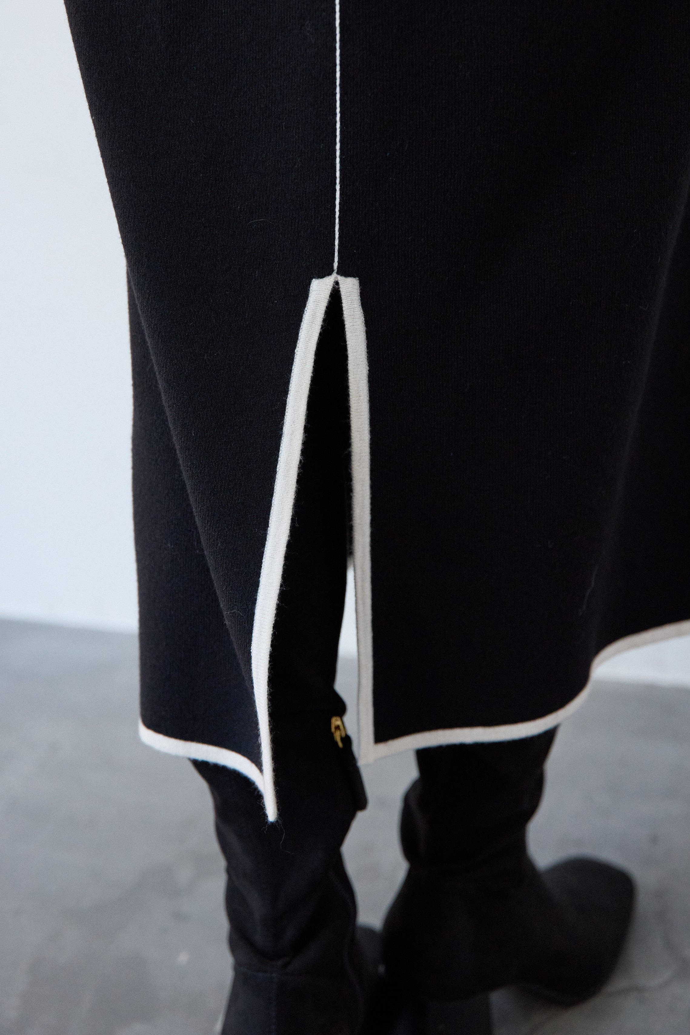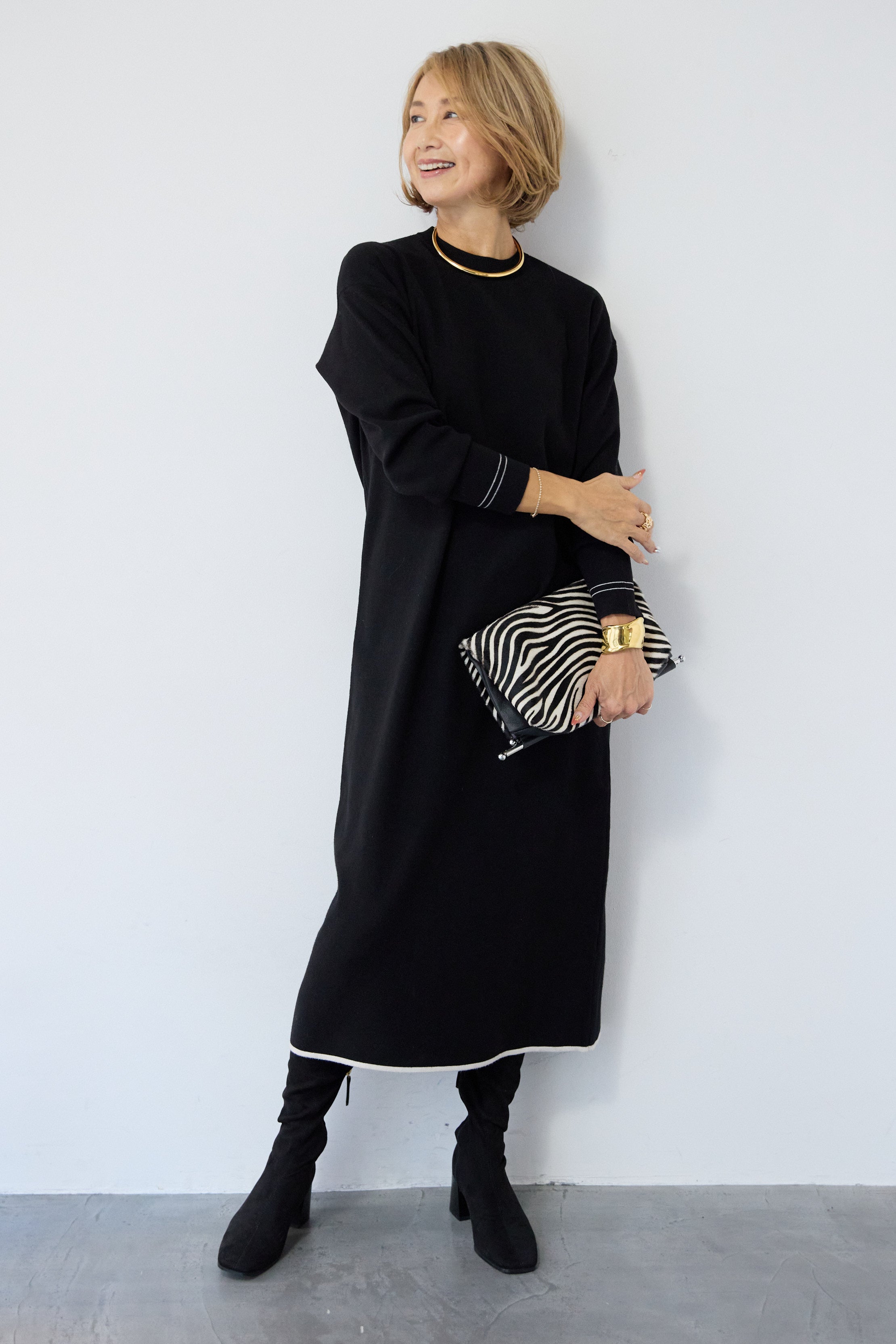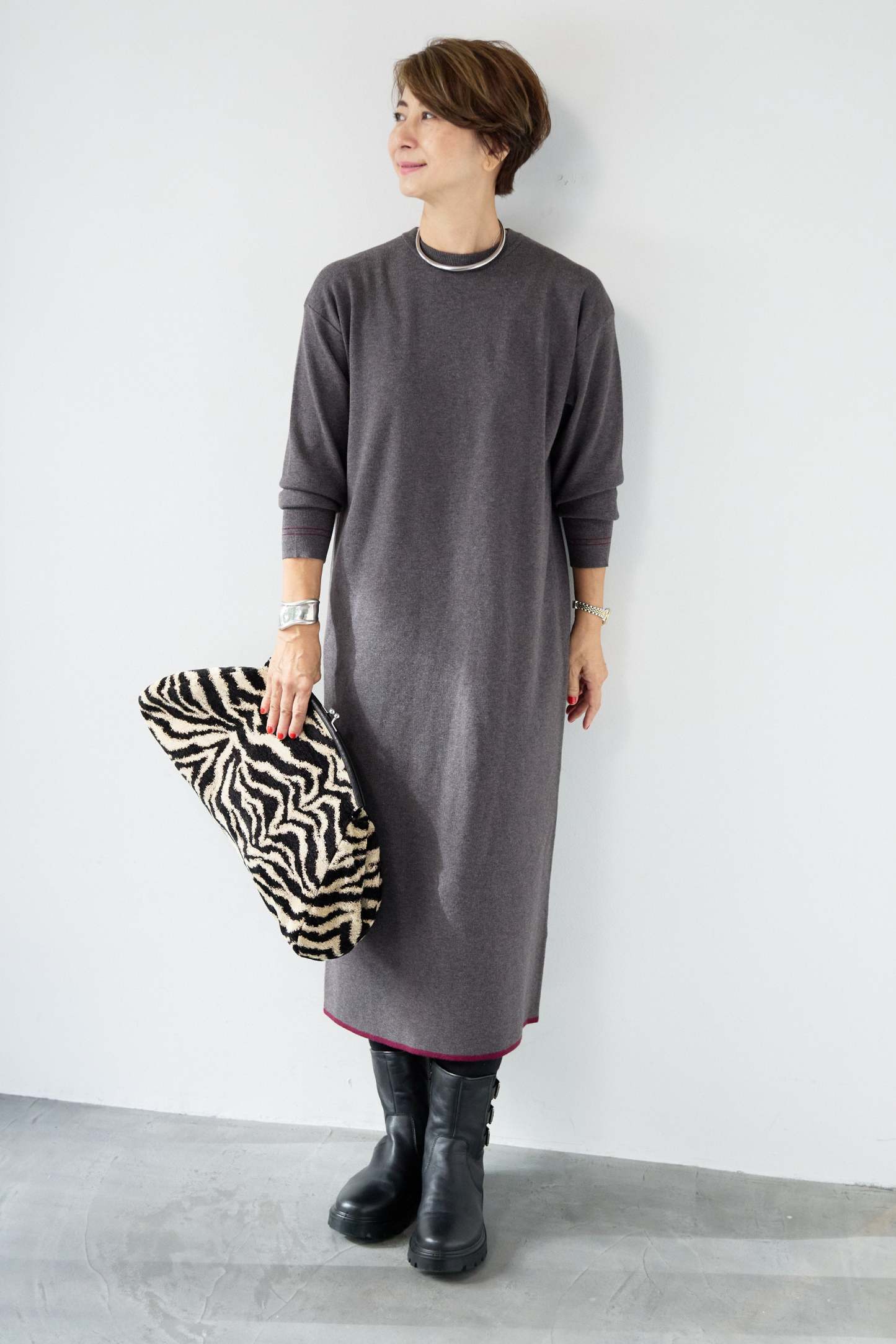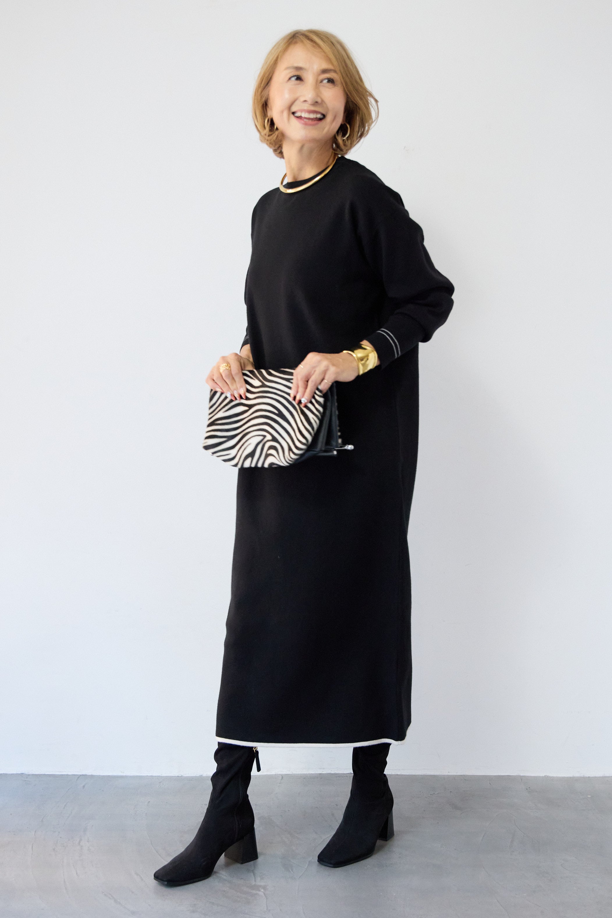 【防静電気】配色ラインやわもちニットクルーネックワンピース