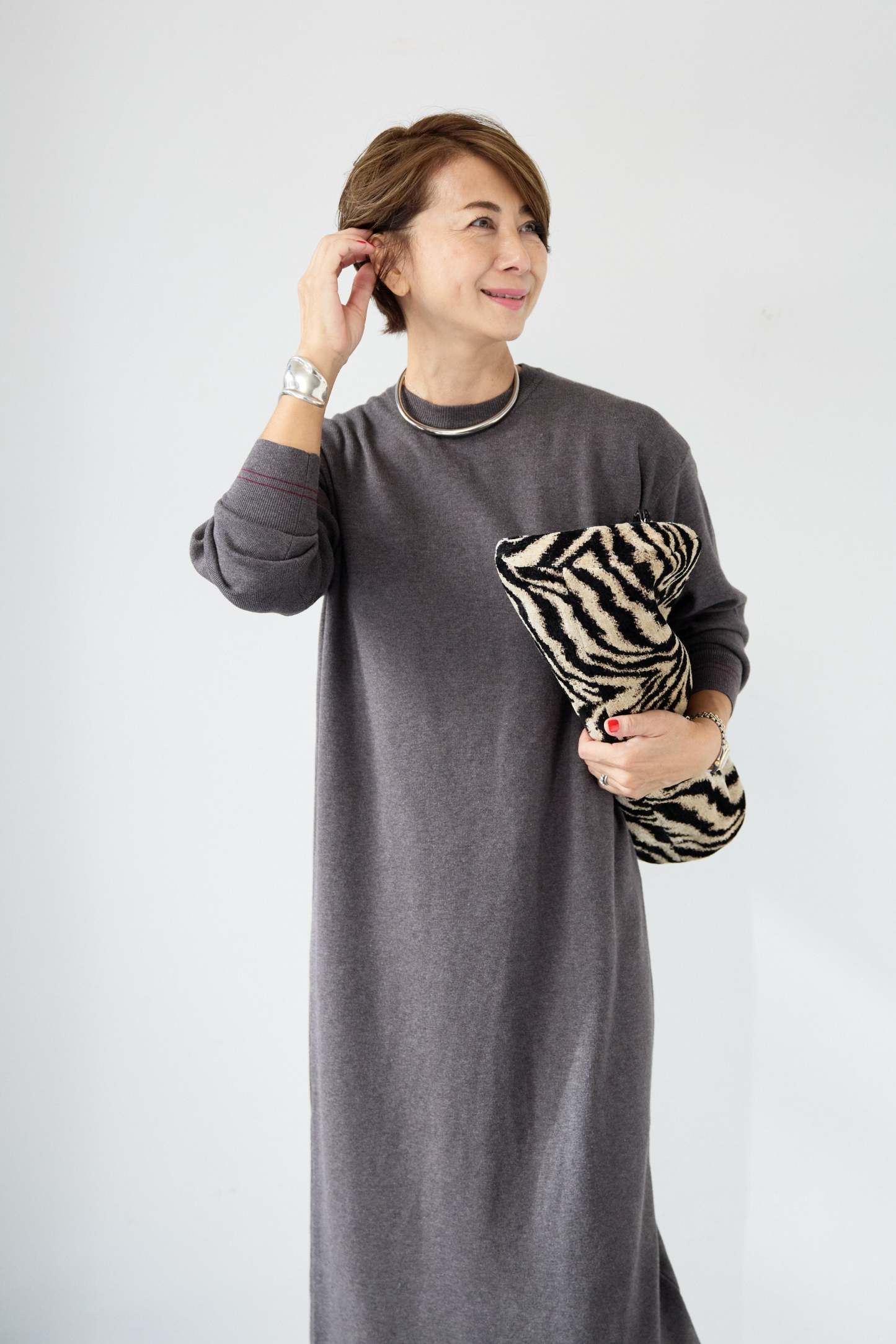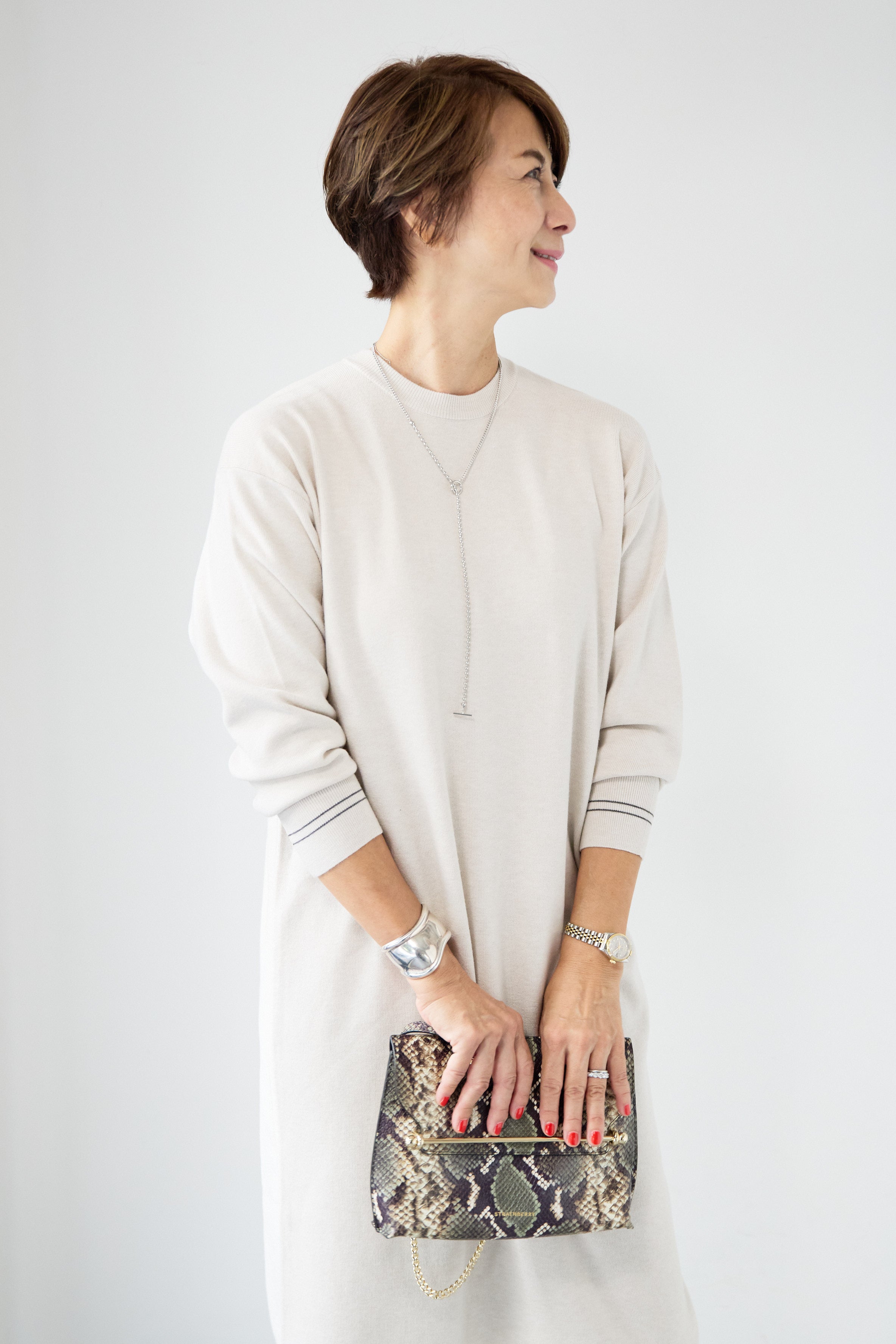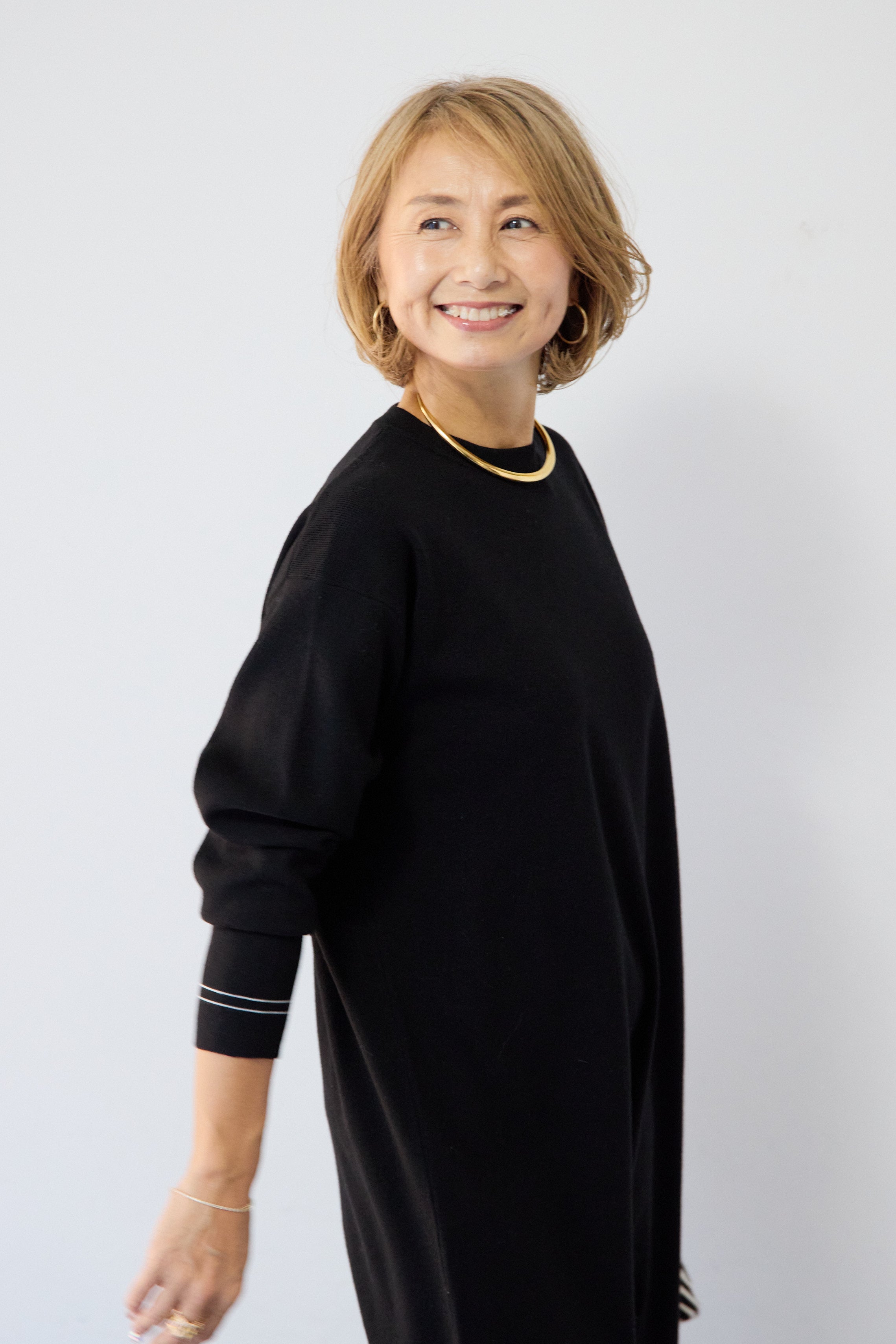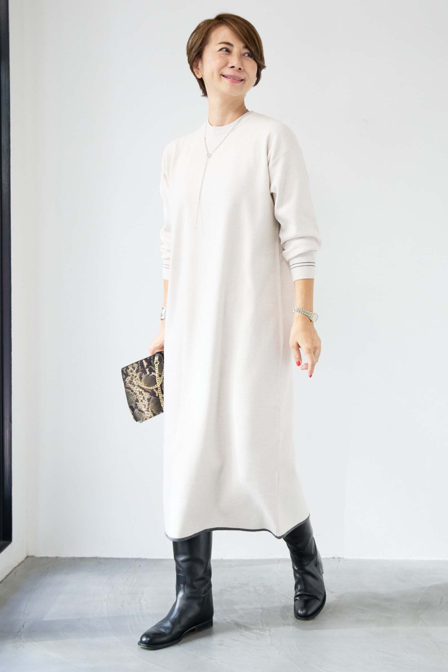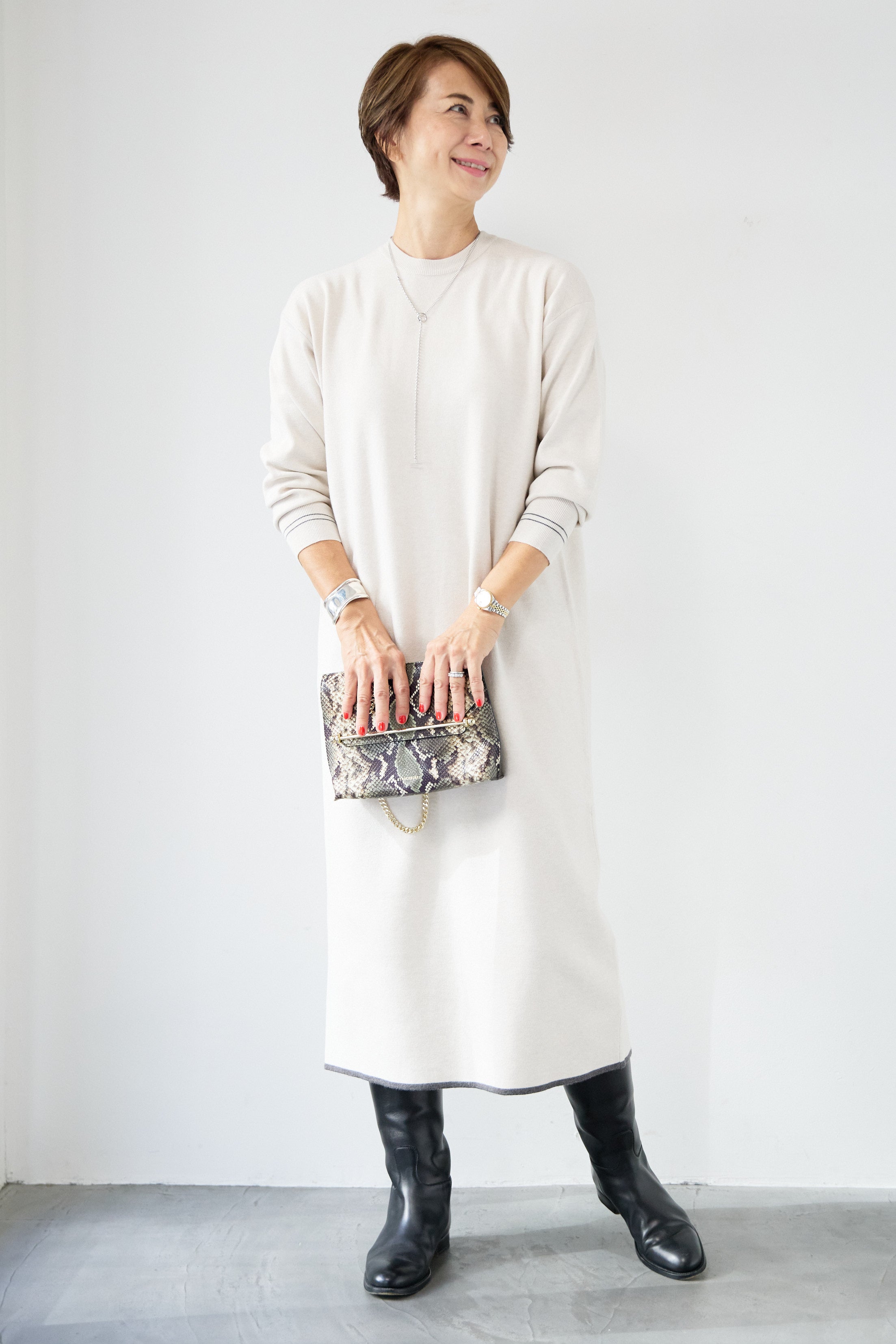 【防静電気】配色ラインやわもちニットクルーネックワンピース